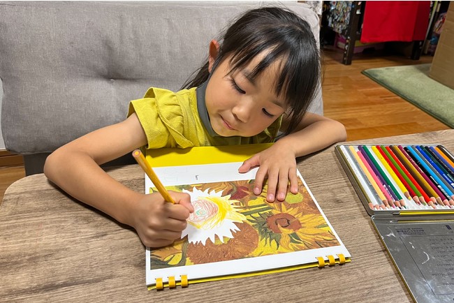 従来の、空白部分を色鉛筆で描き足していくことで、気軽に名画に触れ想像力を育みながらオリジナルの作品をつくれることに加え、〈画家の名言〉や〈褒め幅が広がる流れ星シール〉など、親子のコミュニケーションのきっかけになる仕掛けがたくさん詰まったぬりえとなっています。