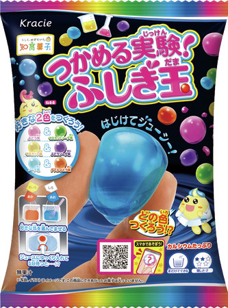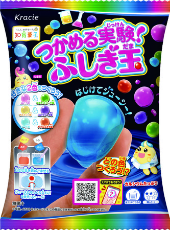 「つかめる実験!ふしぎ玉」は、水を手でつかめる不思議な実験お菓子として、2018年に大ヒットした人気の知育菓子(R)「つかめる!ふしぎ玉」のリニューアル商品です。4つの「玉のもと」を混ぜ合わせて、2色ずつ3つの組み合わせ(全6色)のなかからひとつの組み合わせを選んでふしぎ玉をつくることができます。色だけでなく味も変化するので、何度も実験したくなる、より知的好奇心を刺激するお菓子に進化しました。