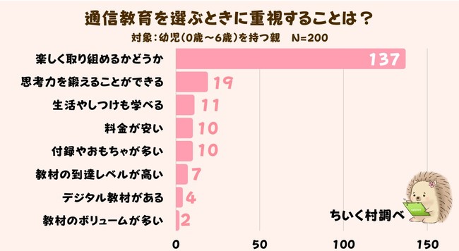 「子供の通信教育を選ぶときに重視することは?」と聞いてみた結果、1位は「子供が楽しく取り組めるかどうか」でした。
