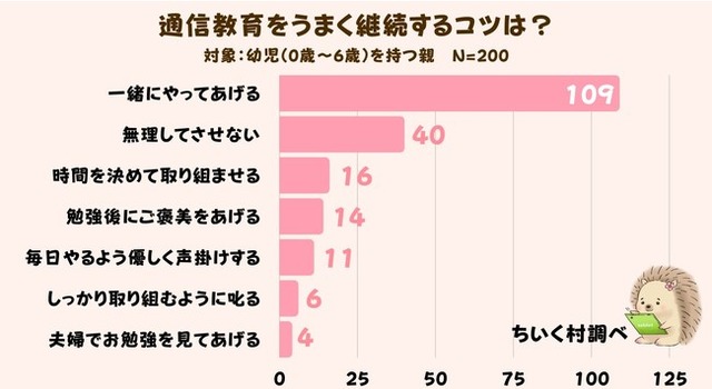 株式会社C.Dreamsが運営する子供の教育メディア「ちいく村」(https://chiiku-baby.com/)は、幼児(0歳~6歳)のお子様を持つ親御さんを対象に「子供の通信教育に関する調査」を行いました。その結果、なかなか続けられない子供の通信教育をうまく続けるコツは「子供といっしょにやってあげること」であることがわかりました。