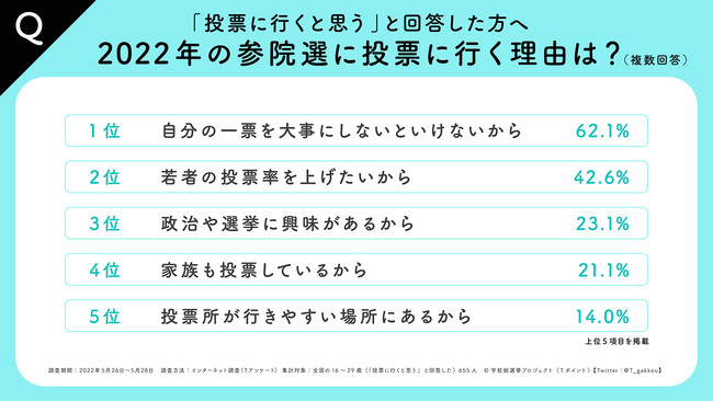 2022参院選に「行く予定」と回答をした人に、その理由を複数選択で聞いたところ、最も多かった回答は「自分の一票を大事にしないといけないから」で62.1%、続いて「若者の投票率を上げたいから」が42.6%、「政治や選挙に興味があるから」が23.1%、「家族も投票しているから」が21.1%、「投票所が行きやすい場所にあるから」が14.0%となりました。自分の一票によって日本の政治やこれからの未来が変わっていく可能性があることを認識し、行動に移そうと思っている若者世代が多いことが見てとれました。