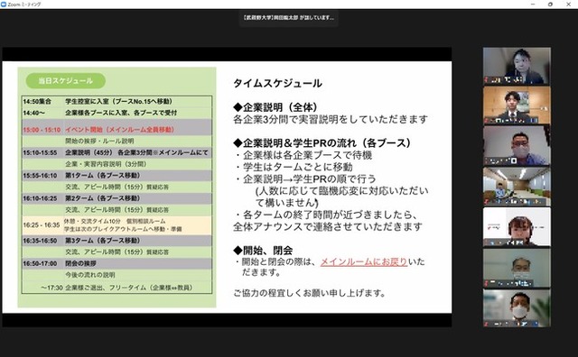 本イベントは効果的なインターンシップの実現を目指す目的で行われ、任意参加のMUDS3年生45名と、企業13社26名がオンラインで参加しました。学生と企業とが双方向にアピールを行うことで、企業が求めるスキルを持った学生とのマッチングを図るとともに、夏休みを利用したインターンシップを実施する予定です。