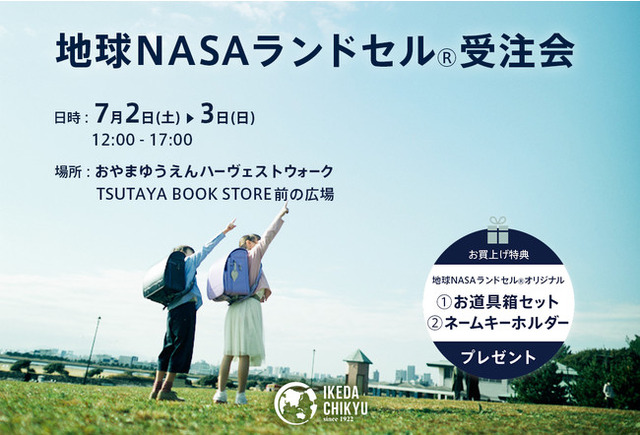 ランドセルの企画・販売を行う池田地球株式会社(本店:東京都港区:代表取締役 村尾光一)は、7/2(土)~7/3(日)の2日間限定で、栃木県小山市の「TSUTAYA BOOKSTORE おやまゆうえんハーヴェストウォーク店」前の広場にて「地球NASAランドセル(R)受注会」を開催いたします。
