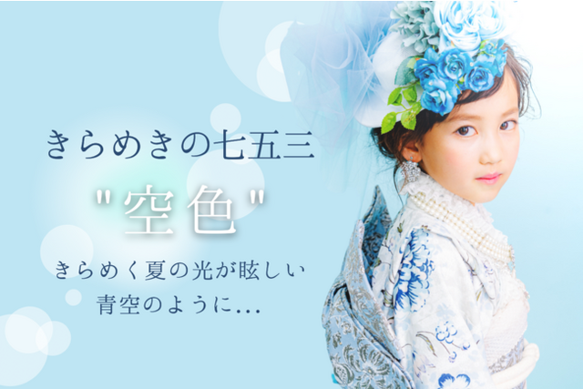 四季折々、うつろいゆく着物の姿を楽しみたいお客様におしゃれな七五三の着こなしを提案します。第一弾の春プラン「美わし(ウルワシ)の七五三”花束”」につづく、第二弾の夏プラン「きらめきの七五三 ”空色”」は、夏の青空をイメージし空色のグラデーションが美しい花やチュール、きらめくパールやビジューのアクセサリーで優雅な装いを演出、お子様の輝く笑顔が際立つおしゃれな七五三撮影を楽しみたいお客様に提案します。