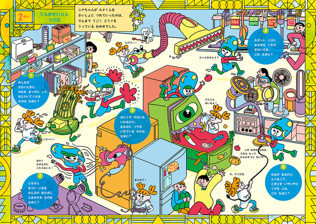 ショッピングモールの各店には、さまざまな品物が並んでいます。おもしろい物を見つけたり、親子でほしい物を言い合ったりしながら、お買い物遊びが楽しめます。また、なぞなぞショッピングモールの図面(フロアマップ)も掲載しているので、ルナくん、ニナちゃんがたどったルートがわかります。