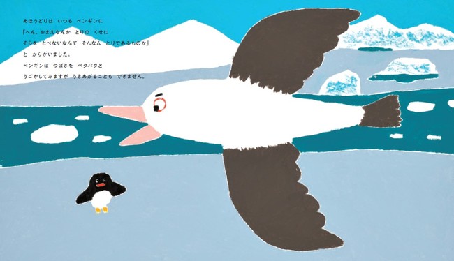 「鳥なのに、翼はあるのに、空を飛べない」あほうどりにからかわれて、ペンギンは落ち込んでしまいます。