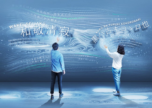 利休がz残したことばの川。枯山水は水が流れる風景を表現した庭園で、渦巻きの模様は悟りや心理、世界観や宇宙観も表す。茶の湯の心をあらわすことばが、美しい枯山水となって壁面や空間に描かれ、そのことばから利休の精神性や想いを体感する作品。