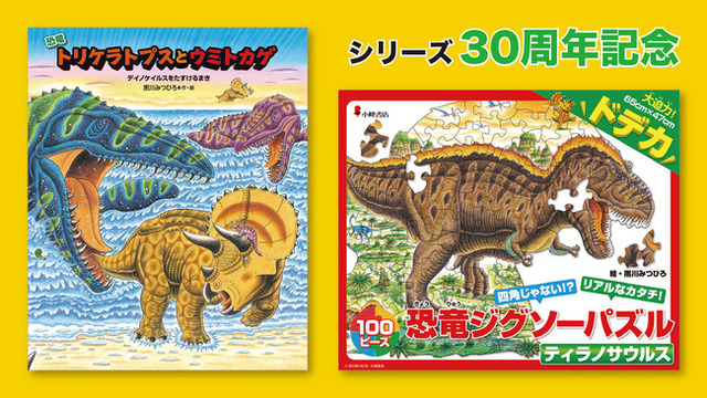 黒川みつひろさんが描く恐竜たちをパズルで楽しめるスペシャルアイテム「恐竜ジグソーパズル」(各税込価格1980円)が、シリーズ30周年を記念して登場します。大迫力のドデカサイズで、四角じゃないリアルな形の新感覚パズルです。ラインナップは『トリケラトプス』&『ティラノサウルス』の2点で、7月上旬ごろの発売を予定。どちらも絵は黒川さんの完全描き下ろしです。