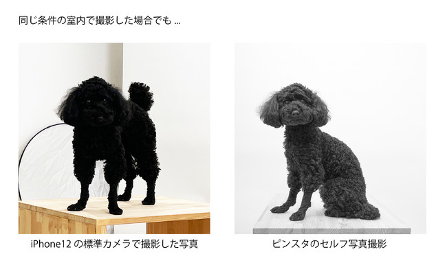 スマホなどで写真を撮るのが難しい黒い毛のわんちゃんでも、ピンスタのセルフ写真撮影だとプロカメラ機材と専用のライティングで黒つぶれすることなく誰でも綺麗に写真が撮れます。ピンスタでは撮影前にペットの毛色に合わせて調整を行い、その子本来の特徴を表現します。