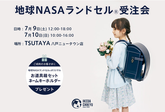 ランドセルの企画・販売を行う池田地球株式会社(本店:東京都港区:代表取締役 村尾光一)は、 7/9(土)~7/10(日)の2日間限定で青森県八戸市の「TSUTAYA八戸ニュータウン店」にて「地球NASAランドセル(R)受注会」を開催いたします。