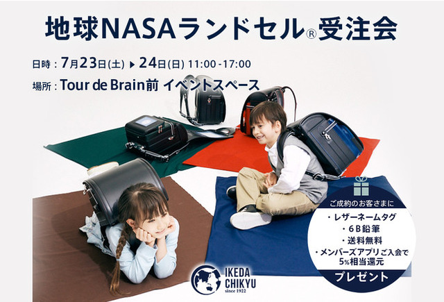 ランドセルの企画・販売を行う池田地球株式会社(本店:東京都港区:代表取締役 村尾光一)は、 7/23(土)・7/24(日) の2日間で、「Tour de Brain さいたまコクーン店」前のイベントスペースにて「地球NASAランドセル(R) 受注会」を開催いたします。