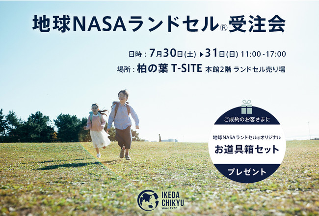 ランドセルの企画・販売を行う池田地球株式会社(本店:東京都港区:代表取締役 村尾光一)は7/30(土)・7/31(日)の2日間限定で、千葉県柏市の「柏の葉 T-SITE」本館2階ランドセル売り場にて「地球NASAランドセル(R)受注会」を開催いたします。