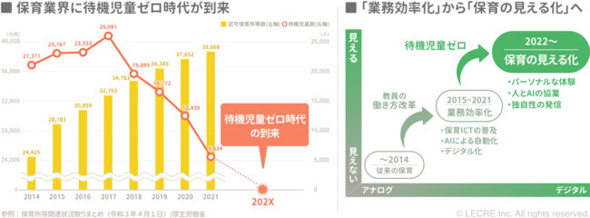 2021年度の待機児童は5,684人と前年度から54%減少(※1)し、待機児童ゼロ時代は間近に迫っています。これに伴い、全国の認可保育所では全体の66%(※2)で定員割れが発生。保育業界の重心は、ICTシステムによる業務効率化から、他園との差別化へシフトし始めています。そこで弊社は、スマホを持ち歩くことが当たり前になった時代ならではの「保育の見える化」に着目。保育士の目線から捉えたこどもの成長が、リアルタイムで保護者に伝わる『せんせいみて!』を企画・開発しました。