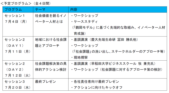 第一弾は、行政機関・荘内銀行・損保ジャパン山形支店から参加者を募り、2022年7月に開催します。今後、他の地域からの参加者を受け入れ、鶴岡発の「地域の社会価値創造人材育成モデル」を広げていきます。