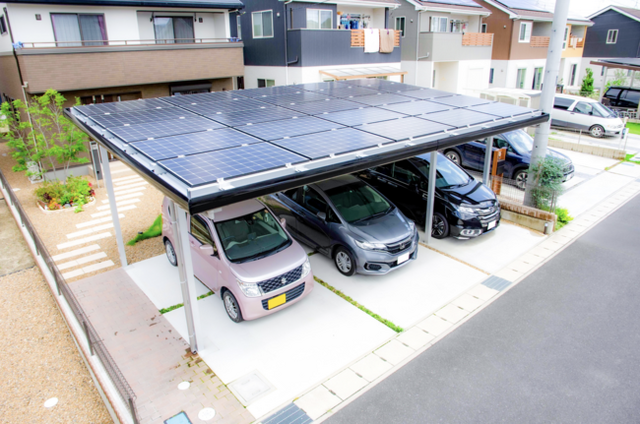 カーポートの屋根の部分に太陽光パネルを設置した車庫のことを指します。太陽光パネルは、住宅の屋根に設置されることが多いですが、実はカーポートにも設置して太陽光発電ができます。ソーラーカーポートを設置することで、駐車スペースのデッドスペースを有効活用し、電気代の削減、災害時の備え、環境問題の改善などのメリットを得ることができます。