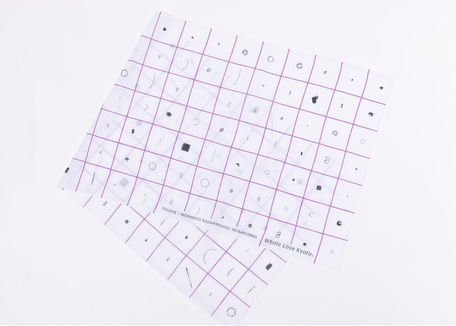 錺金具とは装飾を施した金具のことで、一般的にはお寺や神社、お神輿や仏壇の装飾のことを指します。現在では機械化が進み、手作業で作られることは少なくなっていきました。そんな中、寺社仏閣が多く残る京都で、創業以来約140年にわたり主に手作業で錺金具製作を続けて来られたのが、森本錺金具製作所さんです。錺金具を施すために欠かせないのが「鏨」と呼ばれる道具たちです。職人は何千種類もある鏨の中から図柄に合うものを選び出し、金槌で一つ一つ打ち付けて模様を彫っていきます。その鏨を森本錺金具製作所さんに実際にお借りし、拓本を取り、手ぬぐいのデザインに仕上げました。マスのなかにおさめた鏨の柄は全て柄が違います。その微妙な違いに、京都の手仕事の凄さがぎゅっと詰まっています。
