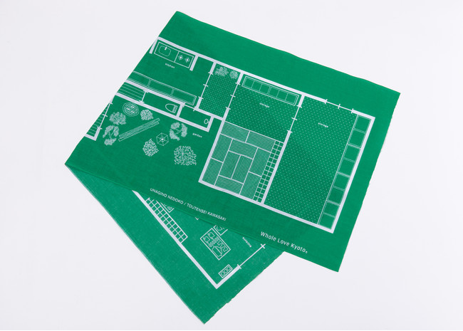 「うなぎの寝床が細長いところ、手ぬぐいに似ているかも、」という気づきがアイデアの発端です。京都に残るうなぎの寝床として、江戸期に創業し現在の店舗は明治時代に建てられたという陶器屋さん 「陶点睛 かわさき」さんに調査のご協力を頂きました。間取り図が残っていなかったため、お店の隅から隅までを実際に測るなど、正確な間取り図を作りました。
