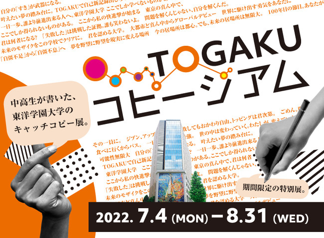 東洋学園大学(学校法人東洋学園 本部:文京区本郷 理事長:愛知太郎)は、中高生が書いたキャッチコピー展「TOGAKUコピージアム」を開催します。「第6回 宣伝会議賞(中高生部門)」において、「あなたが学長になったとして、中高生に東洋学園大学の魅力を伝えるアイデア」というテーマで中高生から募集した多数のキャッチコピーの中から、協賛企業賞をはじめ、評価の高かった作品25点をキャンパス内に展示します。