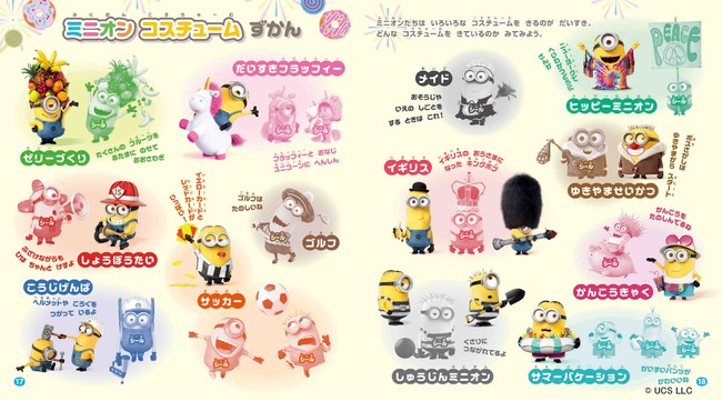 そのほかにも、ミニオンの歴史やミニオンコスチューム図鑑、行事を楽しむミニオンの紹介など、見て楽しいシールあそびのページがいっぱいです。