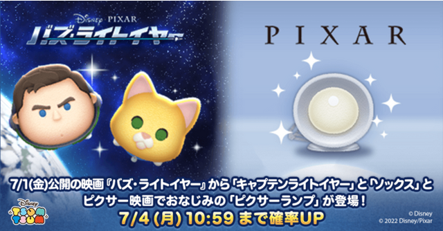 映画『バズ・ライトイヤー』に登場する「キャプテンライトイヤー」とその相棒である猫型ロボット「ソックス」、そしてピクサー短編映画『ルクソーJr.』で初登場した「ピクサーランプ」が、7月1日(金)から7月31日(日)まで期間限定のツムとして登場します。「キャプテンライトイヤー」のスキル演出では、腕に装備されたレーザービームを勇ましく構えるおなじみのポーズが楽しめます。7月4日(月)10:59まで獲得できる確率がアップするので、ぜひ手に入れてみてください。