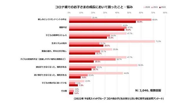 ・悩みのトップ「イベントの中止(55.6%、昨年比▲13.0%)」「運動不足(46.0%、同▲1.9%)」「子どもの居場所(20.5%、同▲18.2%)」は減少。「生活リズムの乱れ」「子どもの預け先」は昨年よりやや増加