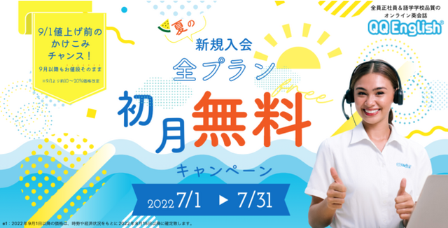 株式会社QQ English (本社:東京都新宿区、代表取締役:藤岡 頼光)は、提供するオンライン英会話サービス「QQ English」「QQキッズ」にて、2022年7月中に新規入会された方を対象に「夏の新規入会 全プラン初月無料キャンペーン」を実施することをお知らせいたします。