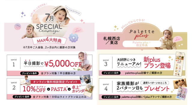 写真工房ぱれっと(有限会社 三景スタジオ)では、ベビーフォトキャンペーンを一新!7月のキャンペーンがスタートしました。また、ホームページもリニューアル。さらにご利用しやすくなりました。