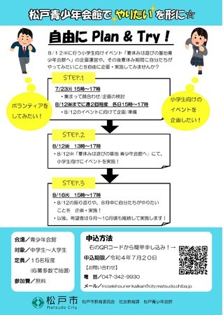 7月23日(土)から「松戸青少年会館で“やりたい”を形に☆自由に Plan & Try!」を開催します。申し込みは7月20日(水)までです。