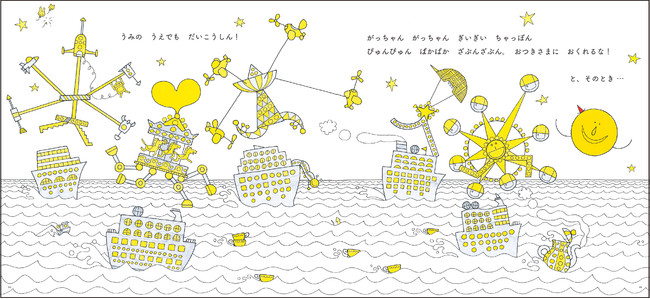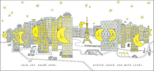 おつきさまが街をお散歩。おつきさまが通ると、みんな、わくわくうれしくなって、ぴかぴか黄色に光り出します。おつきさまはどこに向かうのでしょうか。