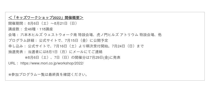 森ビル株式会社(東京都港区、代表取締役社長:辻慎吾)は、2022年8月6日(土)~8月21日(日)の期間、「キッズワークショップ2022」を開催します。過去2年間は新型コロナウイルスの影響でオンライン開催を余儀なくされましたが、2022年は3年ぶりのリアル開催となります。六本木ヒルズやアークヒルズ、虎ノ門ヒルズのテナント企業や店舗などと連携し、全46種・118講座のプログラムをご用意、各界のエキスパートを講師に迎えて、子どもたちに学びの場を提供します。