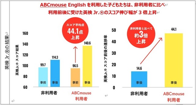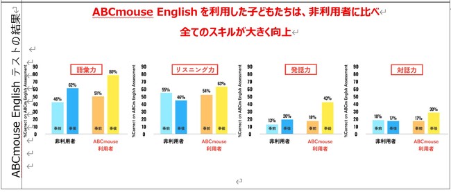 それぞれ2 種類を実施した結果、調査開始前は利用者・非利用者ともに英語力はほぼ同じレベルだったものが、「ABCmouse English」を利用した子どもたちは、非利用者に比べて利用前後に受けた英検Jr.(R)のスコア伸び幅が3 倍上昇し、さらにABCmouse English テスト語彙力、リスニング力、発話力、対話力のスキルが向上したことが明らかとなりました。