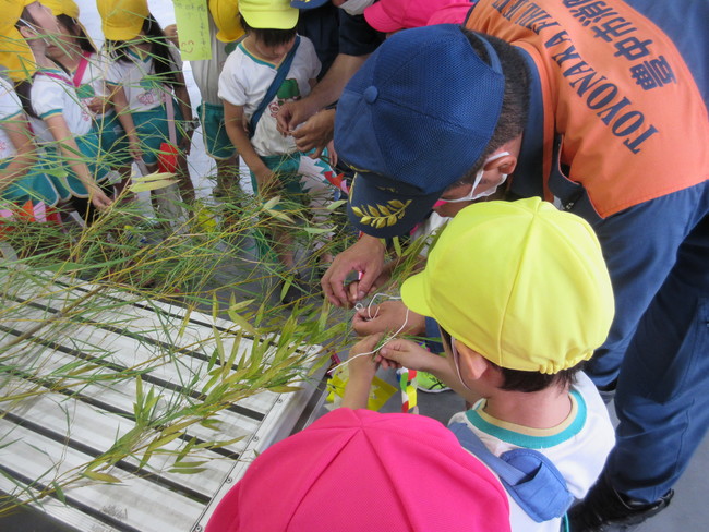 七夕飾りには、火災予防やまちの安全への願いを込めて、園児たちが書いた短冊などを飾り付けました。ジャンボ七夕飾り作りと展示は昭和53年(1978年)から開始。今年で45回目です。