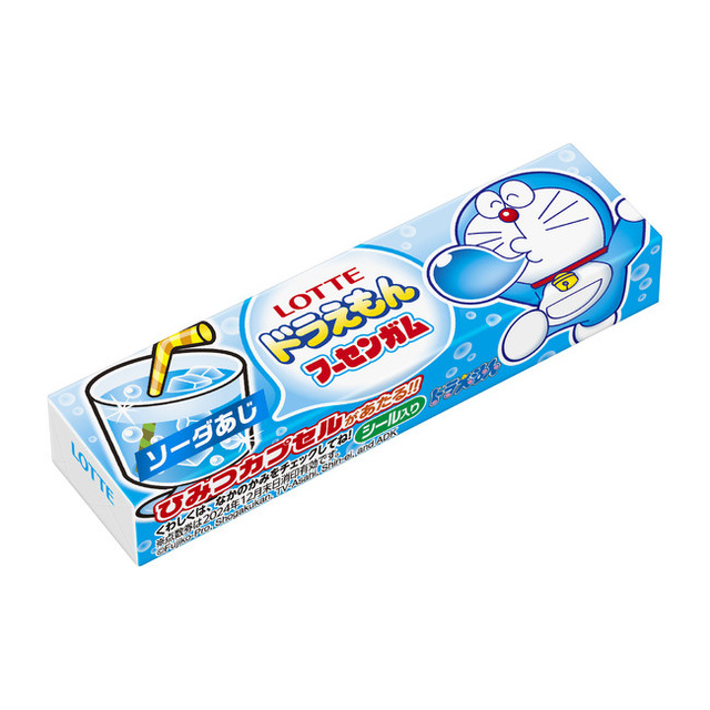 さわやかなソーダ味のフーセンガム。パッケージデザインには初めて、ドラミちゃんが加わり、全5種類。ガムの内装紙にはたのしい企画がいっぱい!