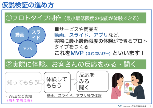 短い期間かつ超低コストでMVPを作成し、実際にユーザーに体験してもらい、獲得したフィードバックをもとに改善を加え、より完成度の高い製品・サービスを市場に出す事業開発の手法となります。