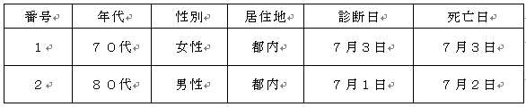 ~新型コロナウイルスに関連した東京都からのお知らせ~ 都内で新型コロナウイルスに感染した方が死亡されましたのでお知らせします。 お亡くなりになった方のご冥福をお祈り申し上げます。 [画像: https://prtimes.jp/i/52467/3232/resize/d52467-3232-0435dd21398deaa40e55-0.png ] ※ 患者・御家族の人権尊重・個人情報保護に御理解と御配慮をお願いします。プレスリリース提供:PR TIMES