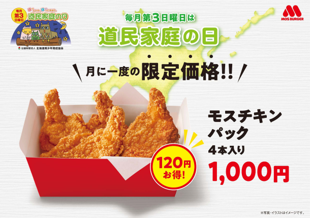 ■内容 :『道民家庭の日』に店舗ご利用のお客さまに、モスチキン4本を『道民家庭の日』特別価格1,000円でお買い求めが可能。