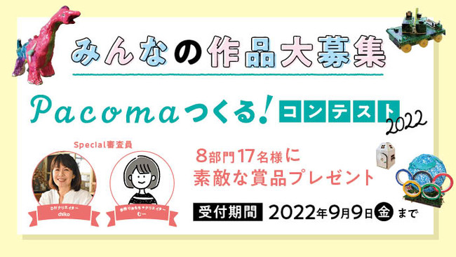 近年、夏の恒例企画として認知されてきている『Pacoma工作コンテスト』。本年は『Pacomaつくる! コンテスト』と題し、クラフト、木工、DIY、手芸、イラストや絵画など「つくる」のジャンルを問わず応募いただけます。「Pacoma」のコンテストは、幼児から大人、親子での共作と幅広い世代が対象の工作・DIY系のコンテストとしても、応募者の方々から支持され続けてきました。今年は計8部門の賞にて開催いたします。