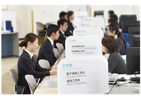 福工大は「就職は教育の一環である」というスローガンを掲げ、全教職員で手厚い就職支援に取り組んでいます。3学部9学科・大学院のすべてに学生の進路実現を担当する専任スタッフを配置。全員と面談し顔と名前、就きたい仕事の分野を理解し、履歴書や面接対策など就職活動の道のりを細やかにフォローします。また、学科ごとの就職担当教員と専任スタッフが密に連携を取り、学生個人に適した手厚いサポートを実施しています。