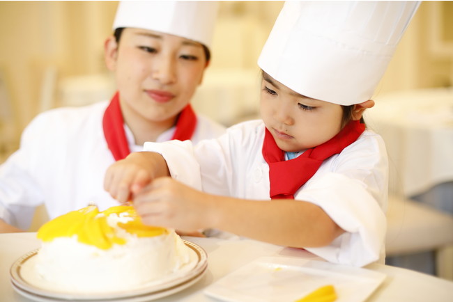 また、ケーキの飾りつけ体験ではパティシエさながらのコックコートを着て、生クリームやフルーツを使ったケーキのデコレーション仕上げを体験します。クリームの絞り方や綺麗な仕上げ方などをホテルパティシエ直伝で学ぶことができます。