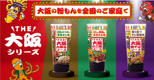 粉もん調理に不慣れな方でもかけるだけで、より本格的に、よりお手軽に大阪の粉もんを楽しんでいただける大阪のソース、大阪人のたこ焼へのこだわりを詰め込んだ『THE大阪たこ焼ソース300』の追加アイテムとして、『THE大阪お好みソース300』『THE大阪焼そばソース300』を新発売致します。