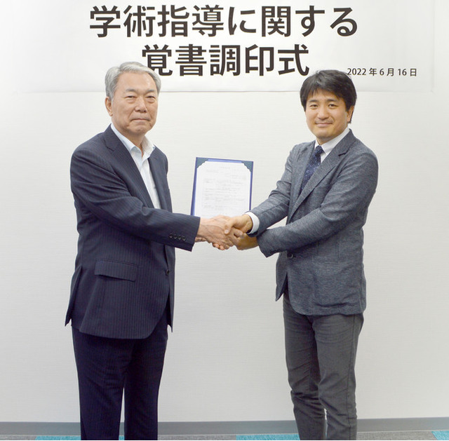 写真は2022年6月16日の調印式の様子(左:アネムHD肥川社長 右:東京大学新藤准教授)
