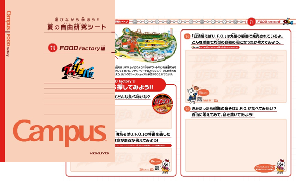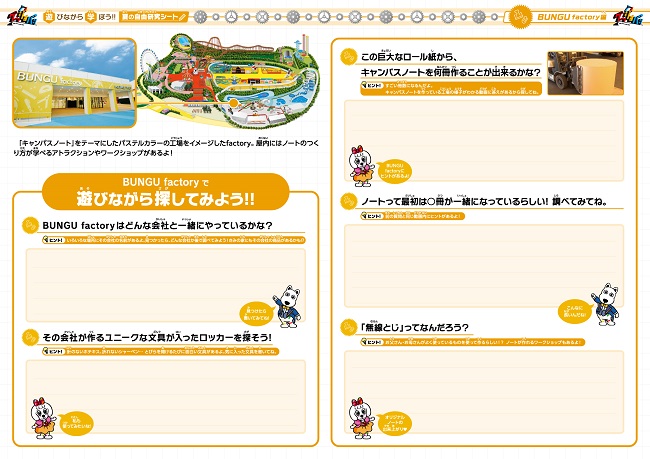 「遊びながら学ぼう!!夏の自由研究シート」を配布します。グッジョバ!!の各ファクトリーに関する設問から構成されている見開き1ページのワークシートです。BUNGU factoryのパートナー企業であるコクヨ株式会社「キャンパスノート」のデザインをモチーフにしています。取り組むワークシートは5種の中から選べます。
