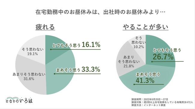 実際に、在宅ワーカーたちもお昼休みの忙しさを自覚しているようです。在宅勤務時のお昼休みについて「出社時のお昼休みに比べてやることが多い」と感じている人は「とてもそう思う」(26.7%)と「まあそう思う」(41.3%)を合わせて約7割(68.0%)。「出社時のお昼休みに比べて疲れる」という回答も「とてもそう思う」(16.1%)と「まあそう思う」(33.3%)を合わせて約半数(49.4%)となりました。
