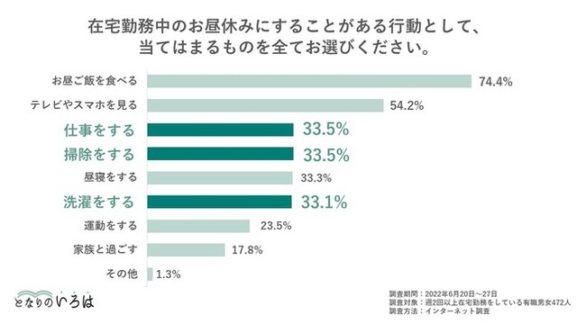 注目したいのは、同率3位となった「掃除をする」「仕事をする」(33.5%)、6位にランクインした「洗濯をする」(33.1%)です。リラックスしたり体を休めたりする休憩時間を過ごすのではなく、家事をしたり、仕事をしたりする人が比較的多いことが分かります。