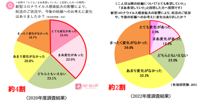 そこで、ベビーカレンダーは、新型コロナウイルス感染症が流行して2年が経った今、妊活に対する意識はどう変化しているのか、アンケート調査を実施しました。その調査結果を、2020年6月に発表した『コロナ禍における第2子以降の妊娠』に関する調査結果と比較し、分析いたしました。