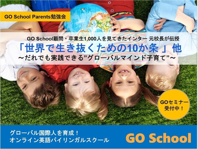 あらゆる年齢層に対し生涯に渡るリカレント教育を提供する株式会社ビジネス・ブレークスルー(所在地:東京都千代田区、代表取締役社長:柴田 巌、以下「BBT」)は、アオバインターナショナルスクール・グループ校のノウハウを集結し、オンラインだけでバイリンガルになれるプログラムを提供する、子ども向け英語バイリンガルスクール「GO School」(https://go-school.net/)において、”グローバルマインド子育て”をテーマにした”GO School Parents勉強会”を開催します。