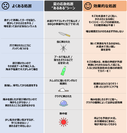 絆創膏ブランド「バンドエイド(R) キズパワーパッド(TM)」を展開するジョンソン・エンド・ジョンソン株式会社 コンシューマー カンパニー(本社:東京都千代田区、プレジデント:黒木 昭彦)は、夏休みに向け、キズケアに関する正しい知識を一人でも多くの消費者に共有するため、埼玉医科大学病院の市岡先生とともに夏によく起きがちなケガのシーンごとに、よくある誤った対応と正しい対応についてをまとめた「夏の応急処置の正しい知識」の令和版を発表しました。