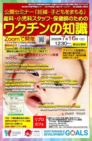 今回は、日本のワクチン行政に深く関与されている医師のお一人でもある川崎医科大学小児科の中野貴司先生、岡山県の感染症対策担当者、先天性風疹症候群の子どもたちと家族の会である「風疹をなくそうの会『hand in hand』」の方々をお招きし、2022年7月16日(土)に産科や小児科のスタッフ、保健師はもちろん、子どもを育てる全ての人々に知ってほしい「ワクチンの話」をオンラインでお伝えします。