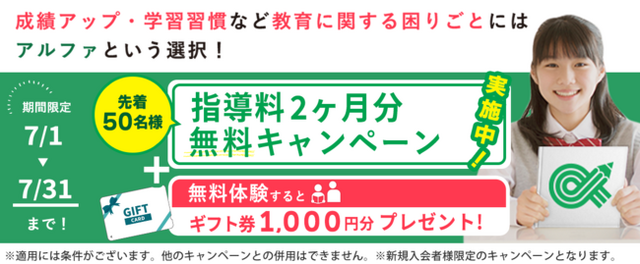 プロ講師による完全オーダーメイド指導の家庭教師や個別教室。勉強嫌い克服・成績アップ・受験対策など、1対1の完全個別指導でお子さまの「できたを増やす」株式会社アルファコーポレーション(本社:東京都豊島区、代表取締役:吉田俊泰)では、現在指導料が最大2ヶ月分無料になるキャンペーンを実施中です!