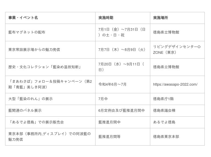 この条例に基づき、「とくしま藍推進月間」である7月には、次のとおり、藍関連の取組みを集中的に展開します。